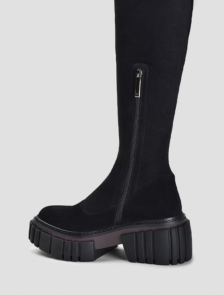 Take your footwear to bold new heights with these Suede Stocking Boots. Made from suede fabrication, they fit close to the legs and have an over-the-knee silhouette. Two tone platform look adds sharpness and unexpected detail to the look.