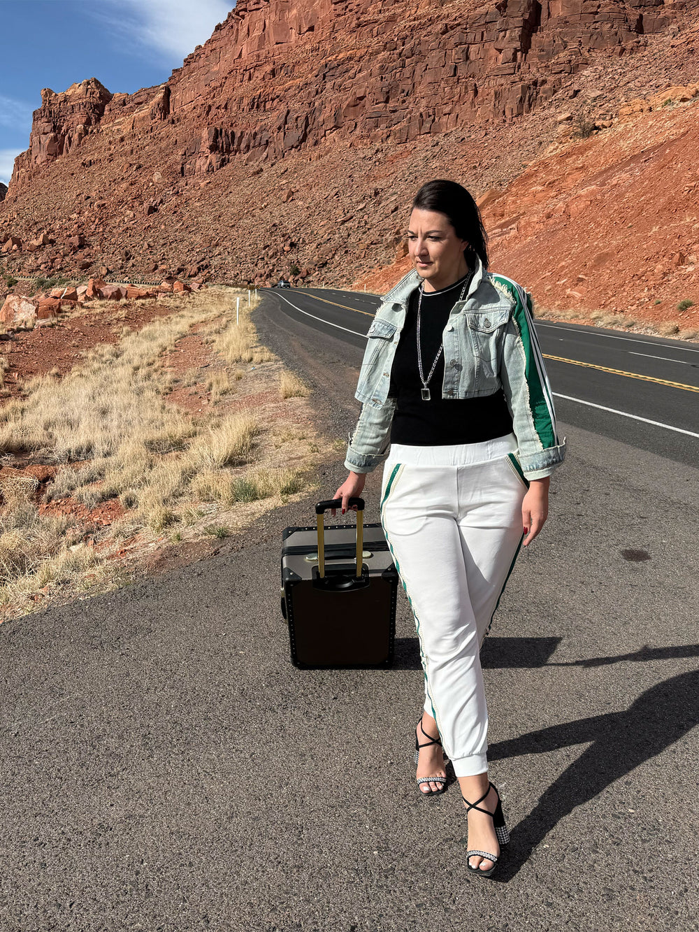 This cropped denim jacket adds a fresh twist to a classic style, featuring bold green and white sleeves for a sporty, statement-making look. Perfect for layering over any outfit, it combines casual comfort with a touch of urban edge.