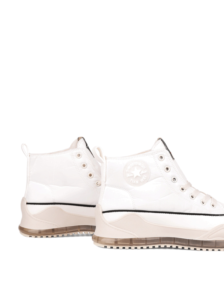Who doesn’t love some fashion hi-top sneakers? Pristinely off-white, these shoes mix a quilted nylon and rubber for some lightness and textural fun!