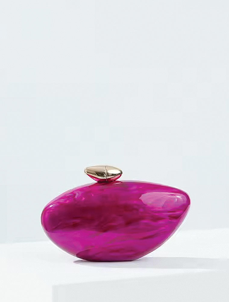 Sculptural elegance meets modern sophistication in this marbled acrylic clutch, featuring a unique organic shape and a lustrous swirl finish. The gold-tone clasp adds a refined touch, making it a perfect statement accessory for evening events and special occasions. Compact yet striking, this clutch is designed to elevate your ensemble with effortless style.