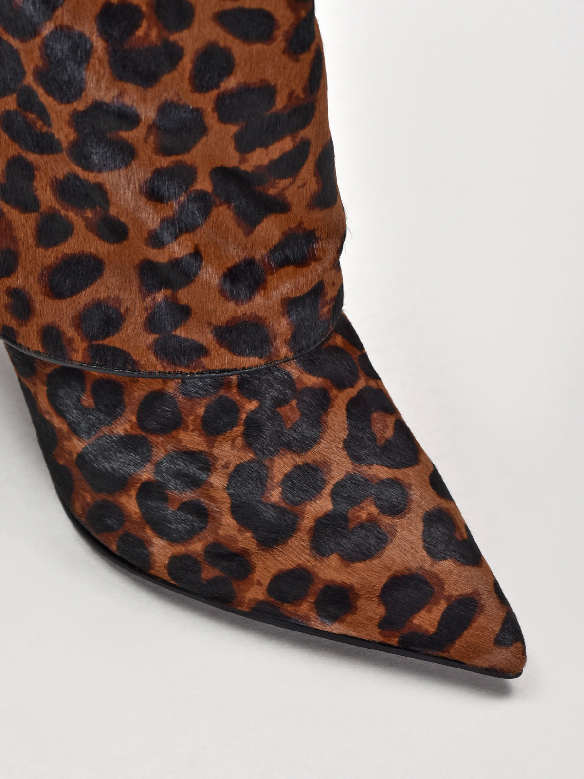 Make a bold statement with these knee-high fold-over cheetah print boots in rich brown tones. Featuring a soft, slouchy silhouette and a striking animal print, they combine fierce style with comfort and drama.
