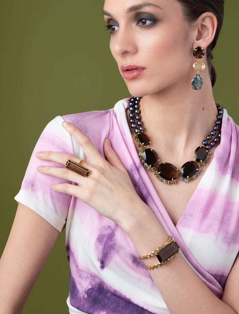The Lucille Ring features a striking elongated smoky quartz gemstone, set in a sleek 14K gold-plated frame. Designed with an adjustable band, this statement ring offers both elegance and versatility, perfect for any occasion.