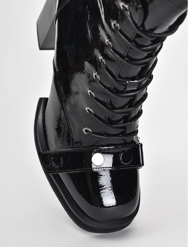 Patent Leather Lace-Up Booties, Black
