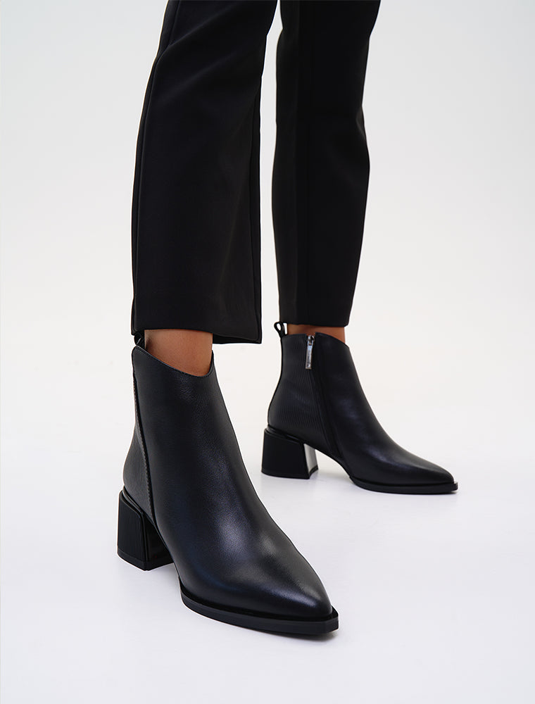 An elevated classic with a modern edge, these Pointy Toe Leather Booties in Black redefine sophistication and versatility. Featuring sleek leather, a sharp pointed toe, and a sculpted block heel, this design brings a bold yet timeless touch to any outfit.