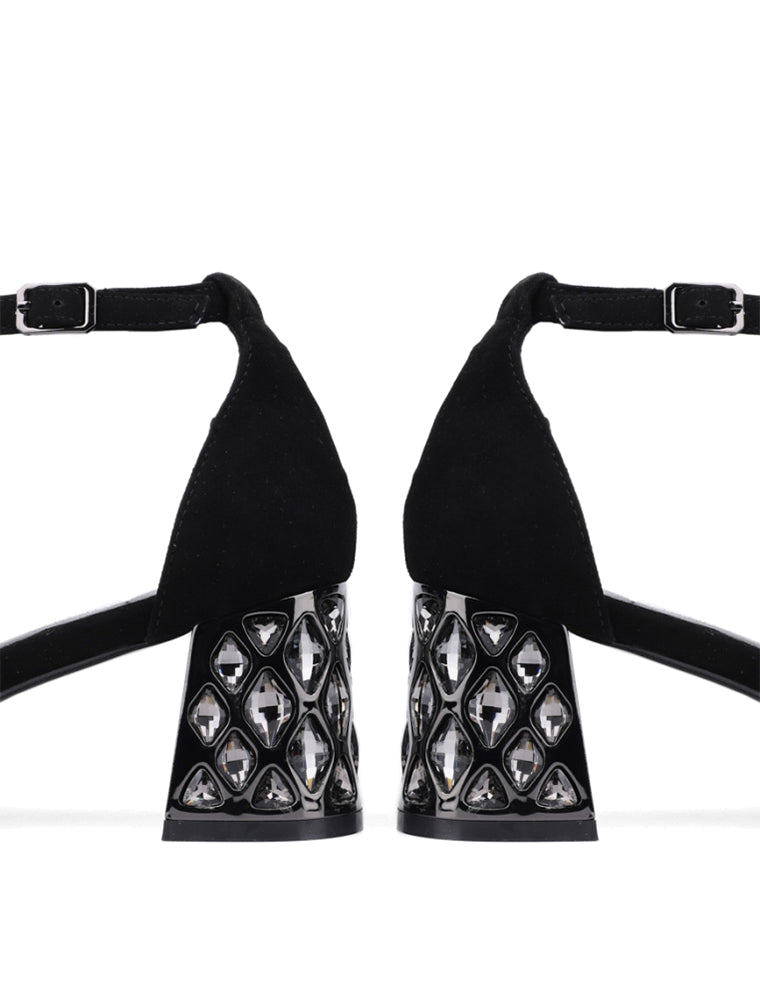 Suede Sandals with Rhinestone Chunky Heel, Black