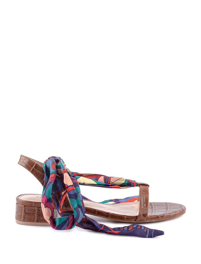 Tie-on Embossed Croc Flat Sandals, Brown
